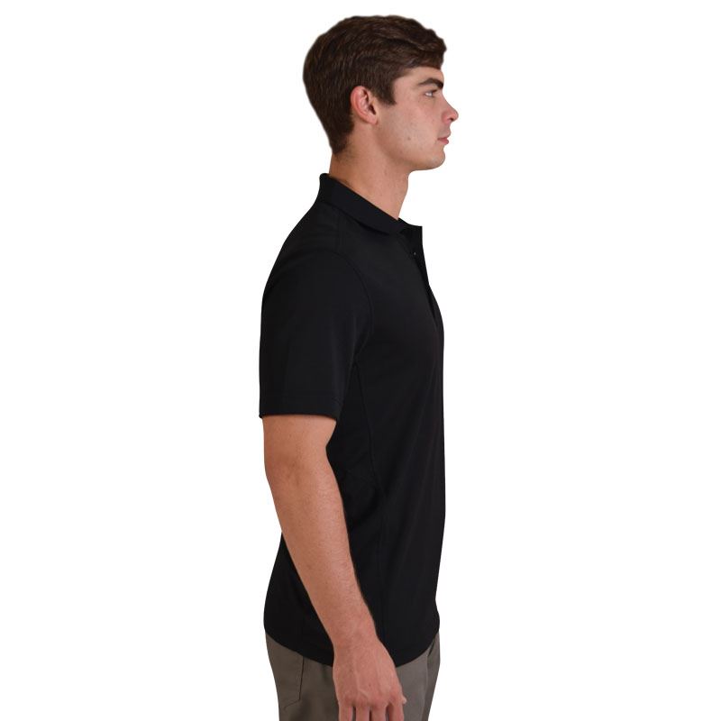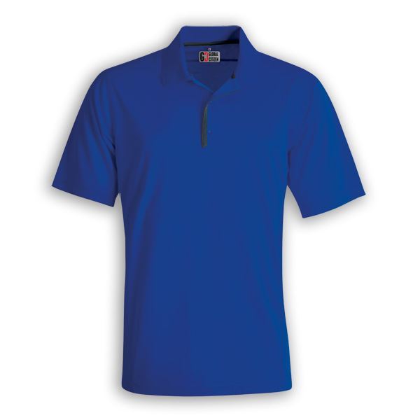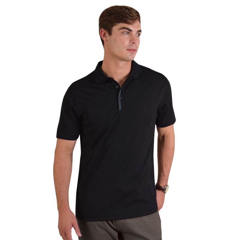 This is a moisture wicking polo with a contrasting grey plaquet and neck binding.