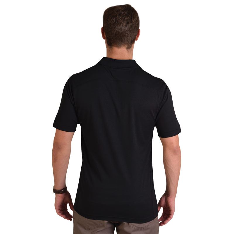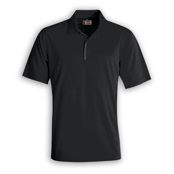 This is a moisture wicking polo with a contrasting grey plaquet and neck binding.
